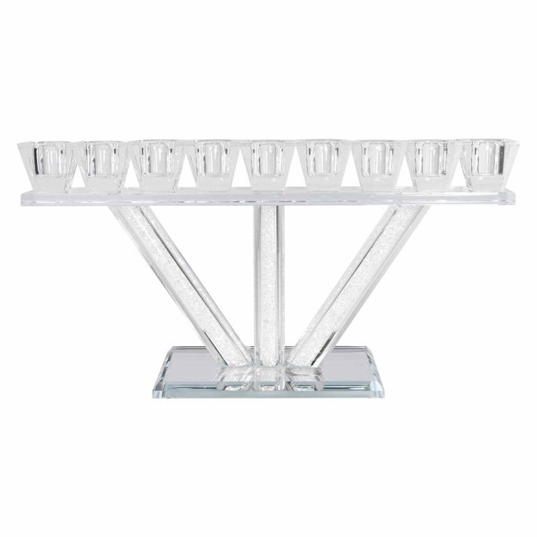 Crafted from high-quality crystal glass, this menorah is a true work of art. Each stem is filled with hundreds of tiny high-quality glass rhinestones, enhancing the glittering candlelight.