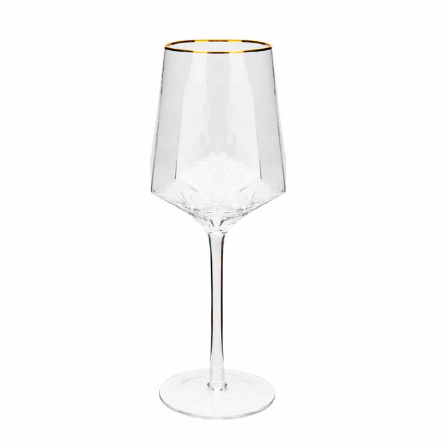 The translucent glass, crafted with a delicately pebbled texture, captures and refracts light beautifully. The angular bowls, elegantly perched on a stem, are designed for a comfortable grip, while a subtle golden stripe along the top rim of the glass adds a touch of luxurious glam.
