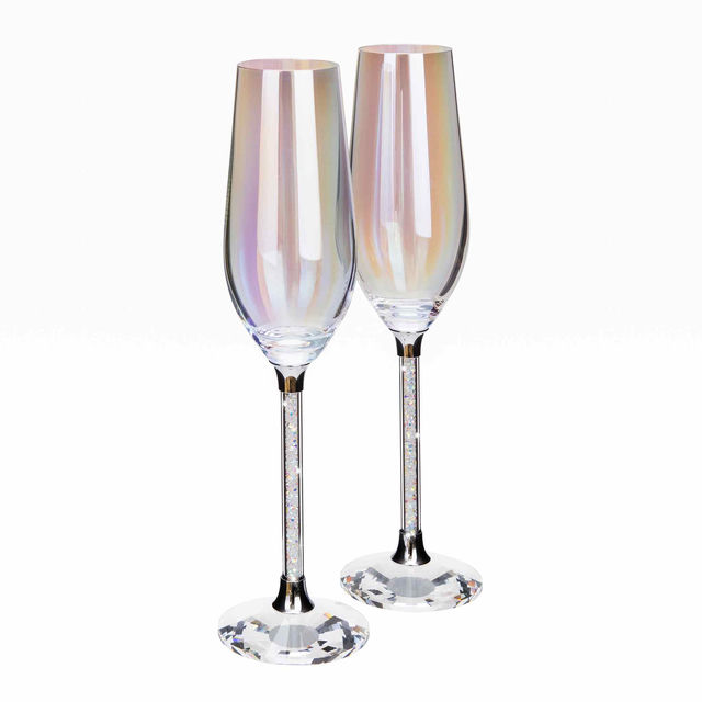 Introducing our Aurora Toasting Flutes - a dazzling addition to your special moments. These champagne glasses bring a pearlescent rainbow of colors to your bubbles, creating a dance of light as you make your toast!
