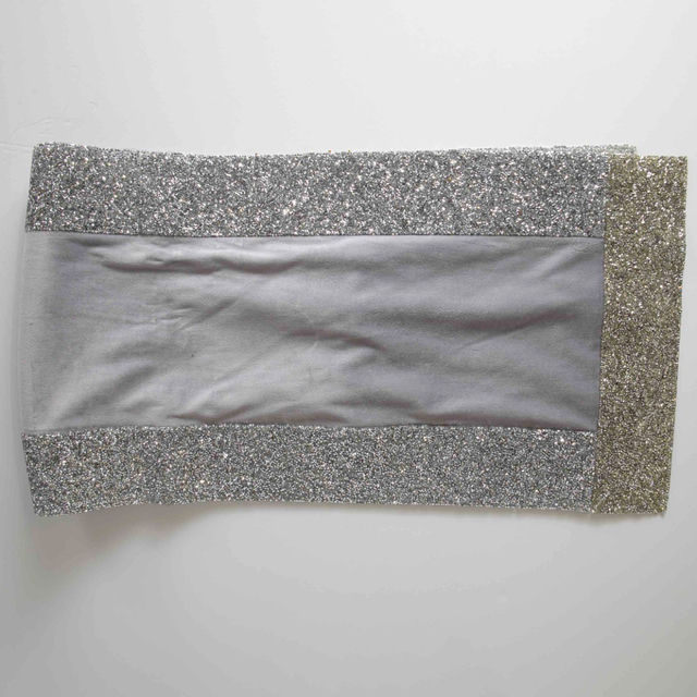 Enjoy multifaceted silver rhinestones on soft gray velvet. Measuring 72 inches long and 13 inches wide. This product was moved to the clearance section due to some of the stones having oxidized, causing slight yellowing.