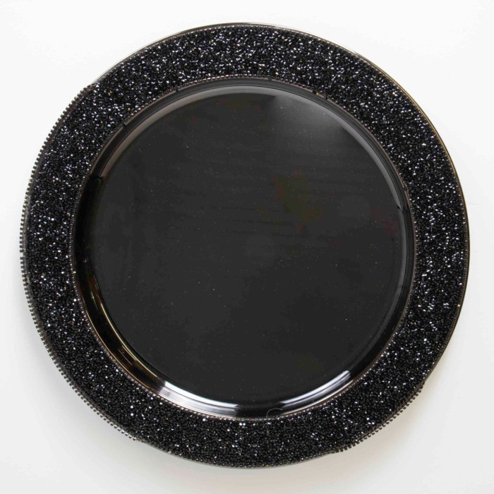 Multifaceted rhinestones sparkle and shine along the rim of this stainless steel charger plate.