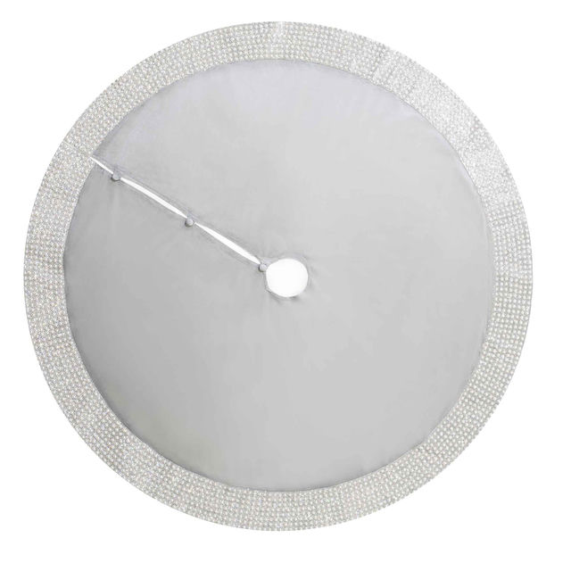 This gorgeous silver velvet tree skirt is studded with a faux pearl and dazzling glass rhinestone border that shimmers from all sides, providing a sparkling spectacle under your Christmas tree.