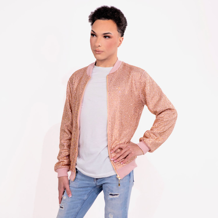 Description / Strass Rhinestone Bomber Jacket - Pink - Small