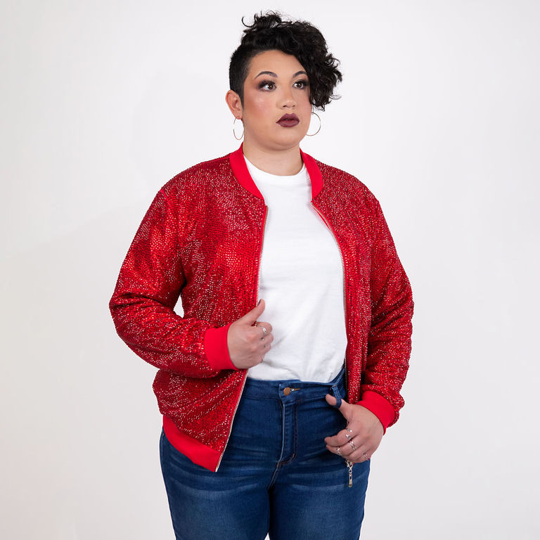 Description / Strass Rhinestone Bomber Jacket - Red - Large